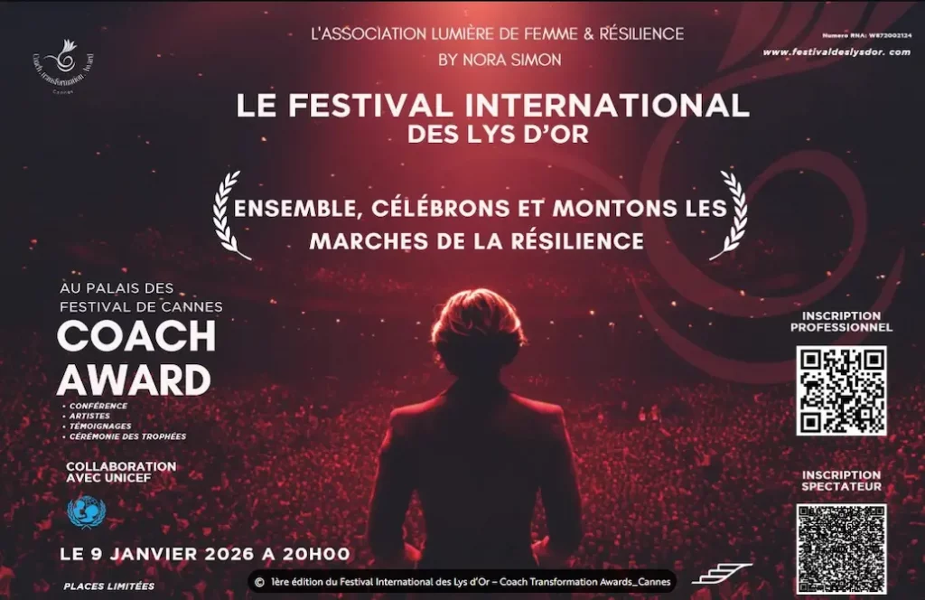 Cannes accueillera le 1er Festival International des Lys d’Or – Coach Transformation Awardsle – 9 janvier 2026 à 20h00 au Palais des Festivals.