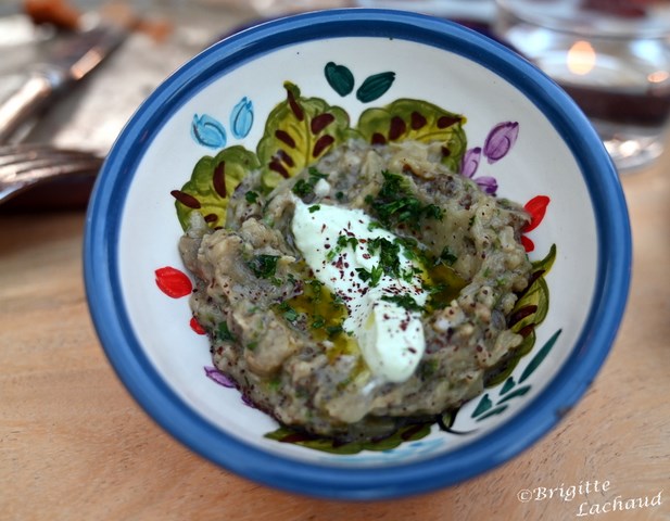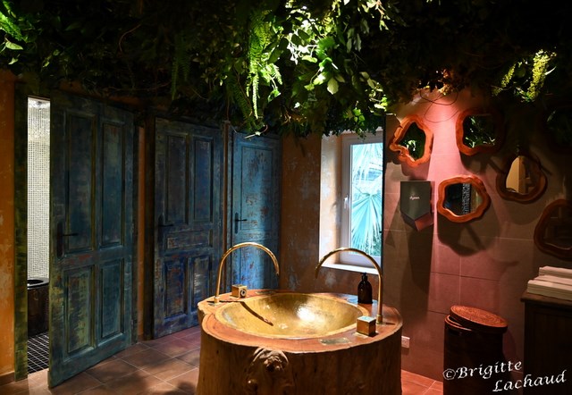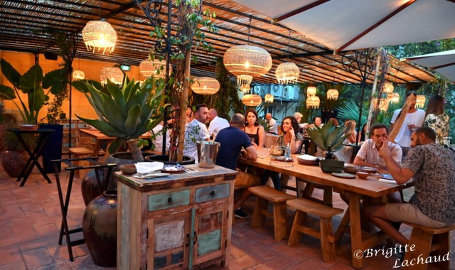 Un mur de bouteilles de verre colorées, la cuisine à la vue de tous, des pierres véritables, des murs blanc enduits à la chaux, de la belle vaisselle en céramique et des vignes, des fougères, florissantes !