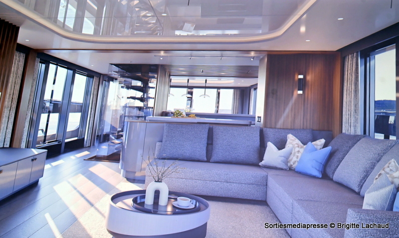 arbore une élégance extérieure et une puissance sportive. Sa conception ingénieuse intègre un grand toit ouvrant, inondant le salon et la timonerie inférieure de lumière et d’air, idéal pour ces moments de navigation à ciel ouvert.