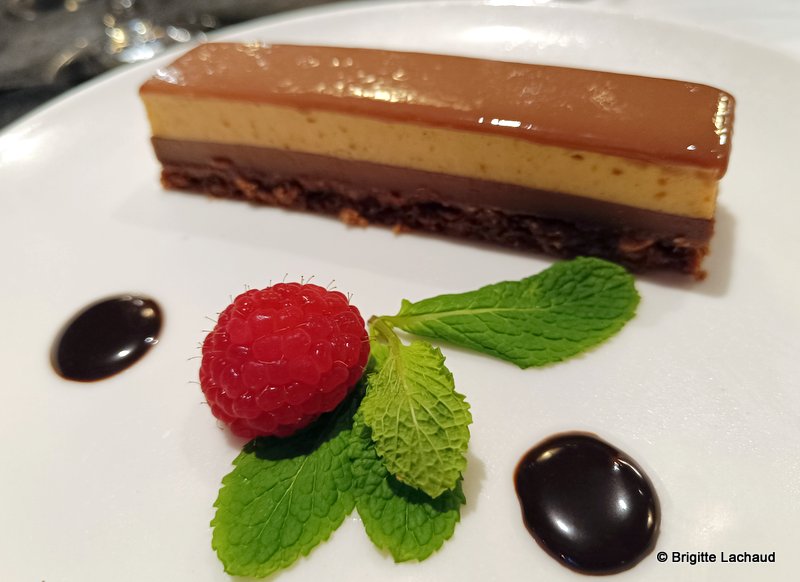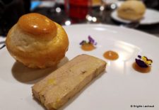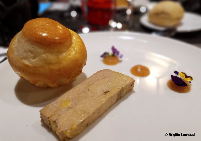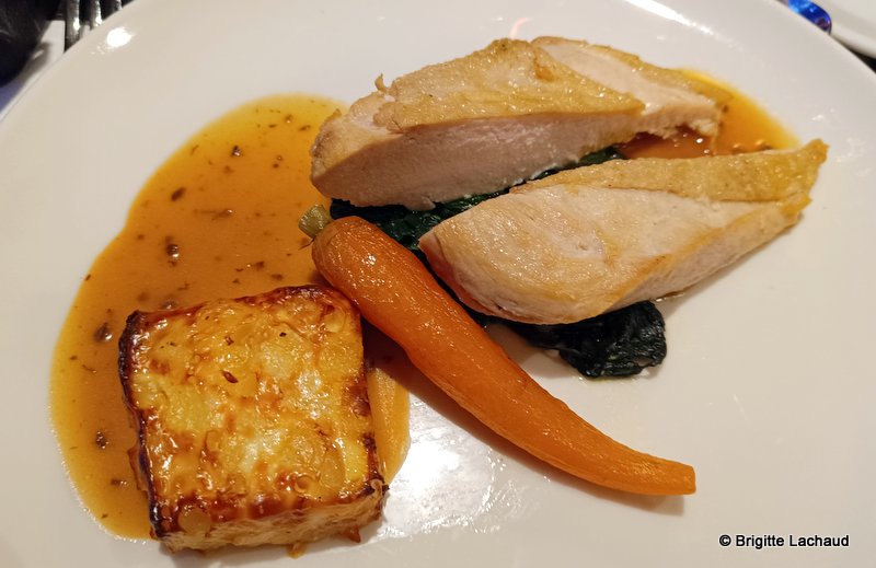 Menu :Champagne Nicolas Feuillatte & ses canapés, Foie gras de canard au naturel, Suprême de volaille rôtie, carotte glacée, jus corsé à la truffe, Finger Noisette, Biscuit moelleux chocolat, croustillant noisette, café, boissons vins AOP.