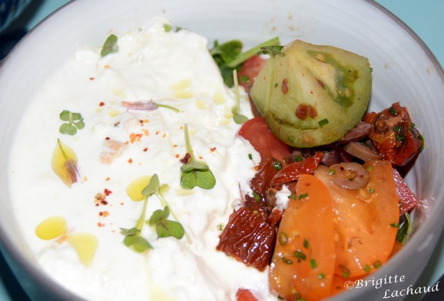 La Stracciatella affumicata, tomates anciennes, huile Alziari bio et olives Taggiasche