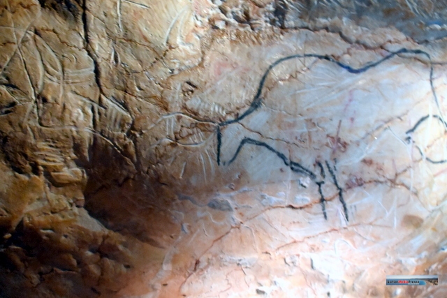 Sur les parois humides se côtoient chevaux, bisons et aurochs, bouquetins et chamois, divers cervidés, un félin et des animaux indéterminés. En tout, 142 animaux. Avec 48 gravures ou peintures, le cheval est l’animal le plus représenté dans la grotte. Dans les grottes ornées paléolithiques, les animaux marins sont très rarement représentés.