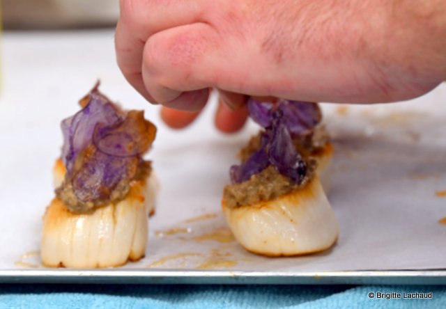 Mise en bouche – Noix de Saint-Jacques piqué aux champignons brun, bouillon corsé lard/oignons – Délicat et parfumé !