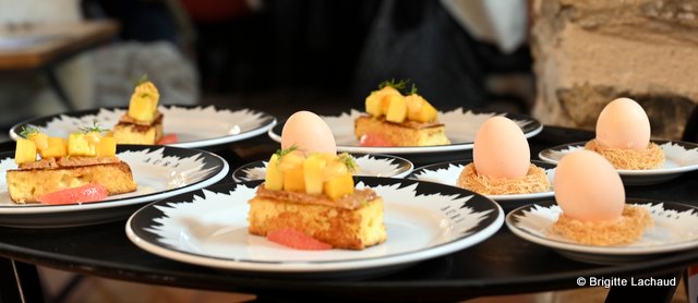 Thomas Holtes : Dessert – Une illusion d’œuf au safran, amandes et agrumes sur son nid parfumé. Sublime ! Preuve de génie aux saveurs exceptionnels !