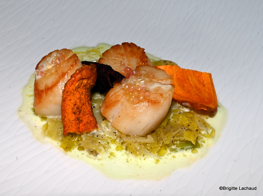Les Saint-Jacques rôties sur leur poireau au sumac, sauce combawa, agrémentée de croustillant de légumes d’hiver